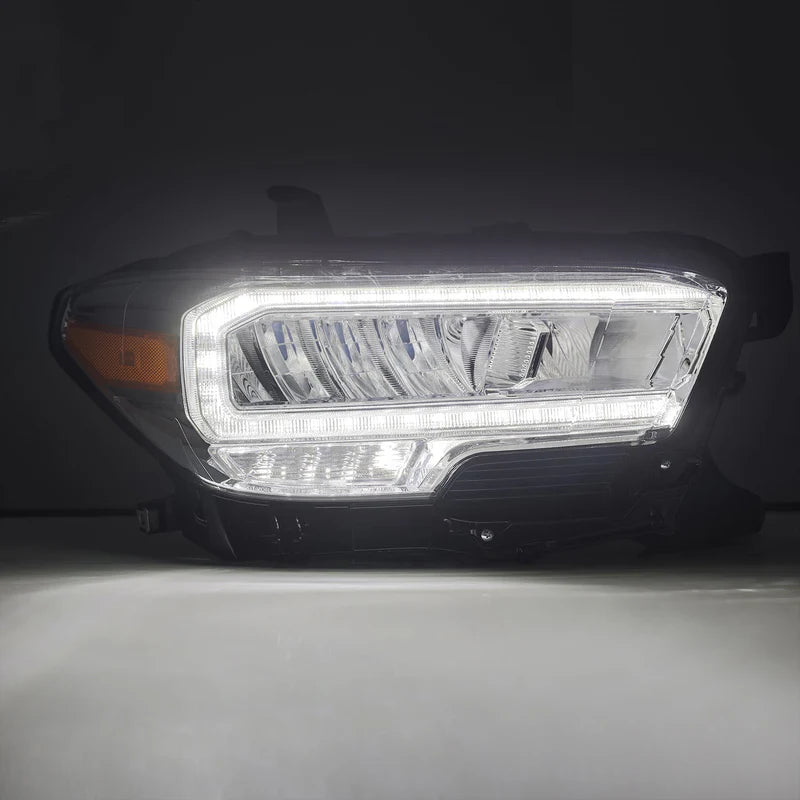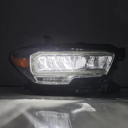 AlphaRex's 3rd gen Toyota Tacoma LUXX-Series crystal headlights are built upon the foundation of the 3rd gen Tacoma TRD LED headlights design, featuring a distinctive LED tube as DRL surrounding the headlights. These headlights boast an activation light feature, serving as a running light when you ignite your 3rd gen Toyota Tacoma, in addition to white DRL light functionality. The amber reflector lens on the side further enhances visibility and safety.