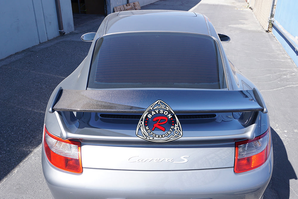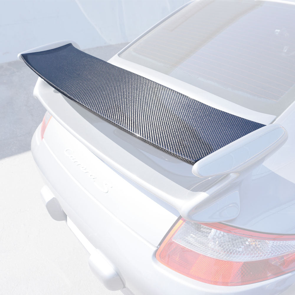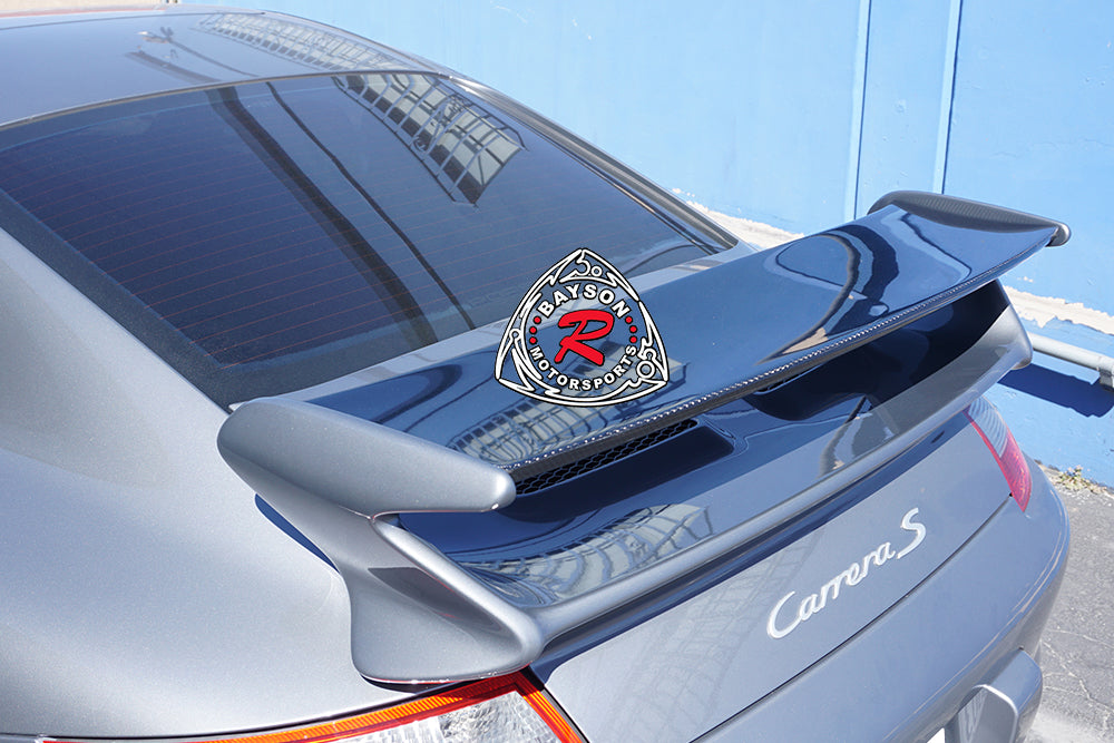 Porsche 997 GT3 Carbon Fiber Spoiler Mid Blade (2007-2008). Enhance your car's appearance with the this spoiler crafted from durable fiberglass. This aerodynamic wing spoiler is designed to increase down force, improving vertical force on the rear of your vehicle. The added down force enhances grip and traction, especially at higher speeds, contributing to better stability and handling. Its precise fit and lightweight construction make it an ideal upgrade for enthusiasts seeking both functional and stylish improvements to their cars rear profile. Elevate your car's driving dynamics while giving it a sleek, aggressive look.