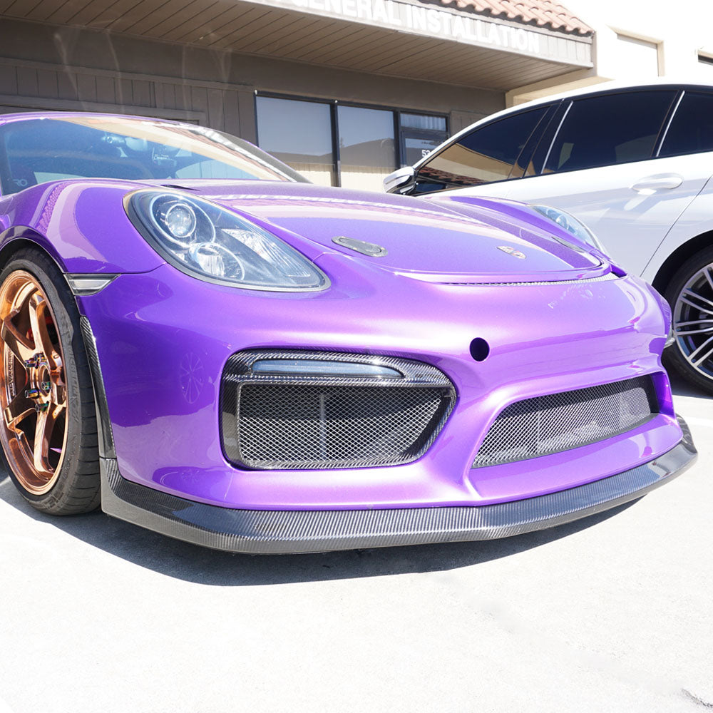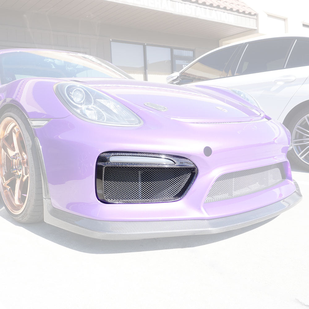 Porsche Cayman GT4/Boxster Spyder 981 Carbon Fiber DRL Radiator Grille Trim (2016). This custom grille enhances your vehicle's front-end appearance with a sleek, sporty look. Engineered as a direct factory replacement, it installs seamlessly without any need for modifications, ensuring a perfect fit and maintaining factory-quality standards. Crafted for durability and style, this grille offers a straightforward way to elevate your car's aesthetic while preserving its original functionality.