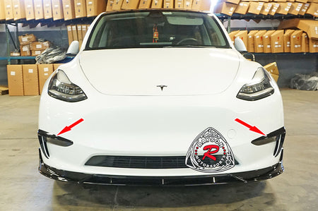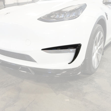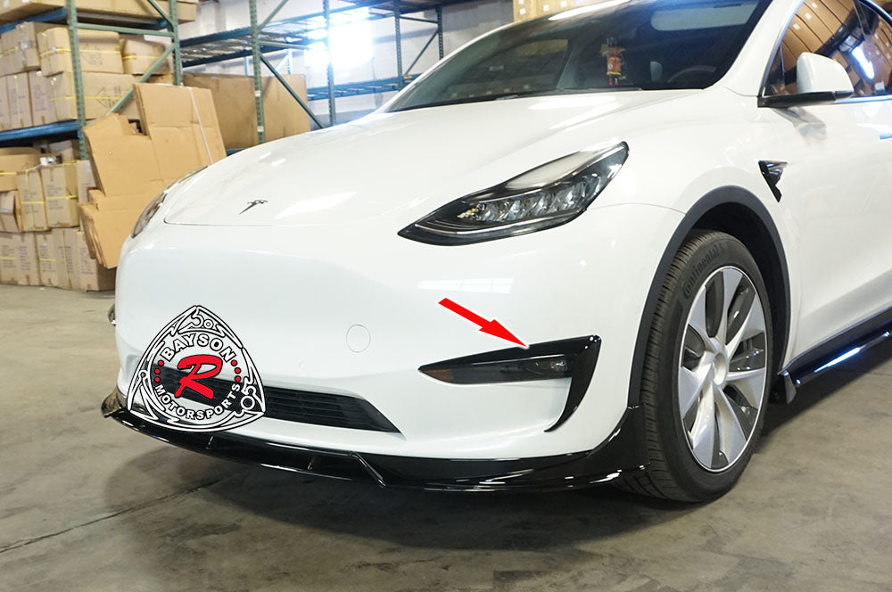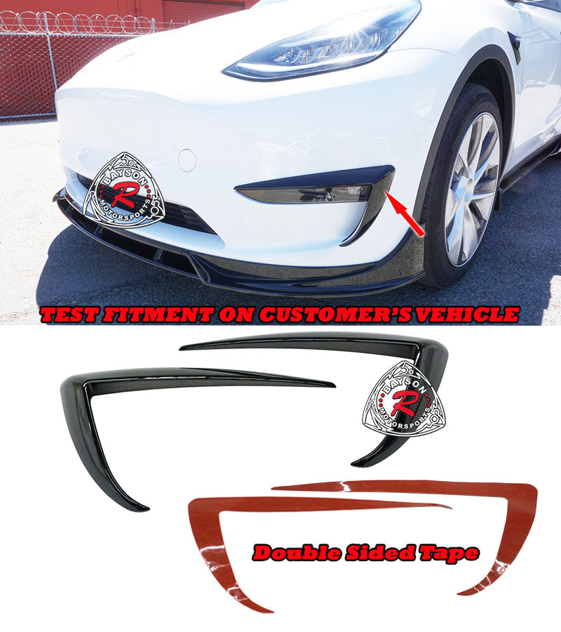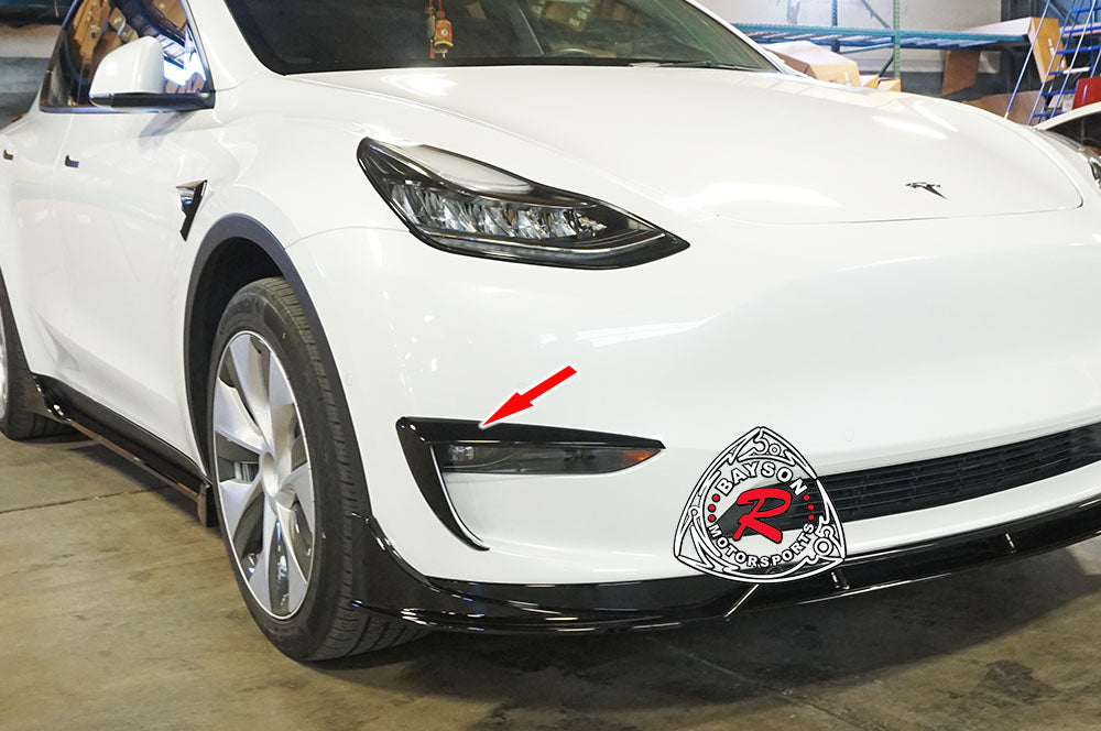Tesla Model-Y Canards (2020-2024) F Style. Auto styling canards crafted from durable polyurethane are designed specifically for your vehicle enhance aerodynamic performance. By generating additional downforce, these canards improve vehicle stability and handling, especially at higher speeds. They help maintain airflow attachment along the sides of the car, reducing lift and increasing cornering precision. Engineered for both form and function, these canards offer a subtle yet effective upgrade to optimize your car's driving dynamics on the road or track.