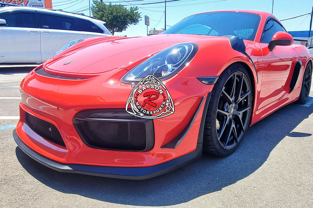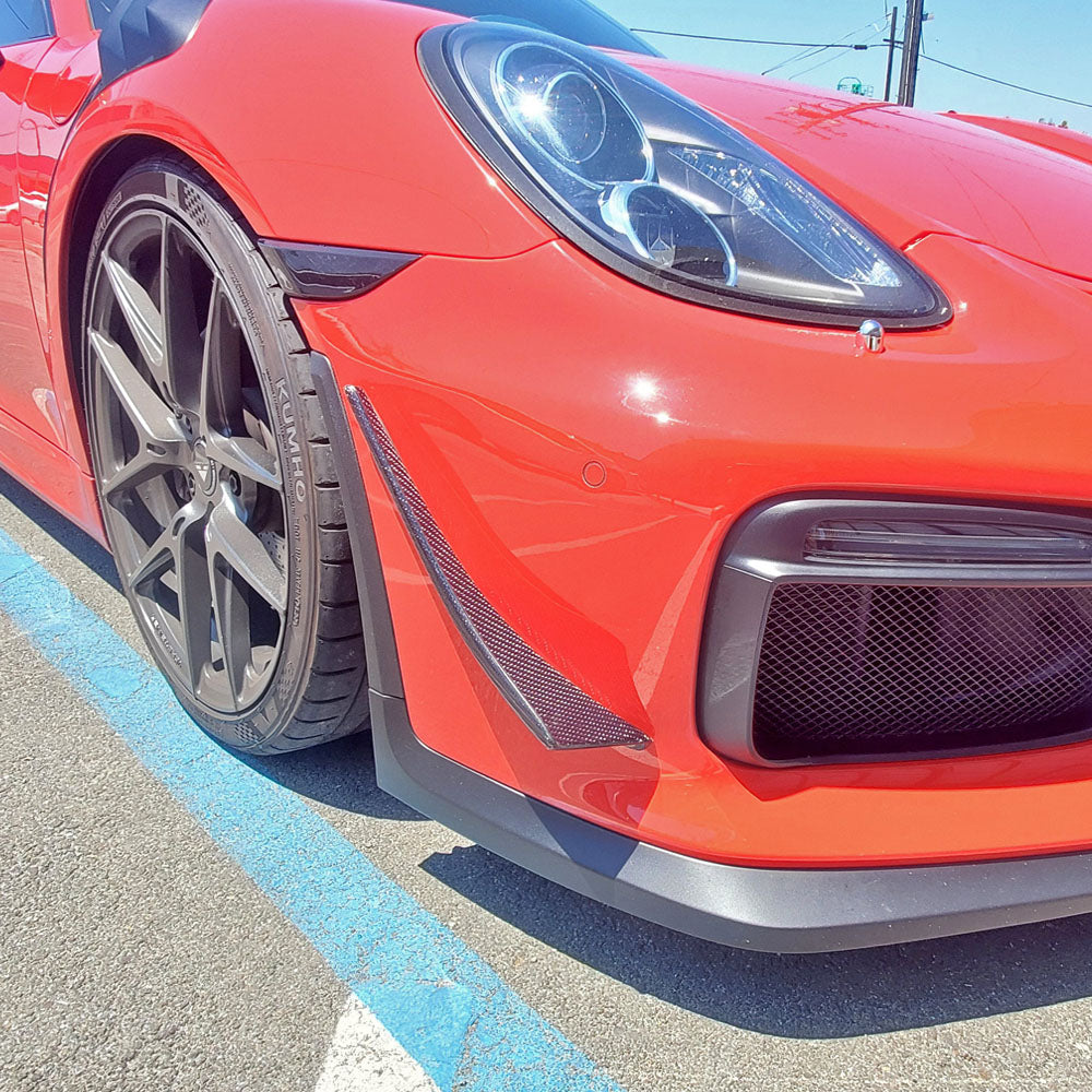 Porsche Cayman GT4/Boxster Spyder 981 Carbon Fiber Front Bumper Canard (2016) . Auto styling canards crafted from durable polyurethane are designed specifically for your vehicle enhance aerodynamic performance. By generating additional downforce, these canards improve vehicle stability and handling, especially at higher speeds. They help maintain airflow attachment along the sides of the car, reducing lift and increasing cornering precision. Engineered for both form and function, these canards offer a subtle yet effective upgrade to optimize your car's driving dynamics on the road or track.
