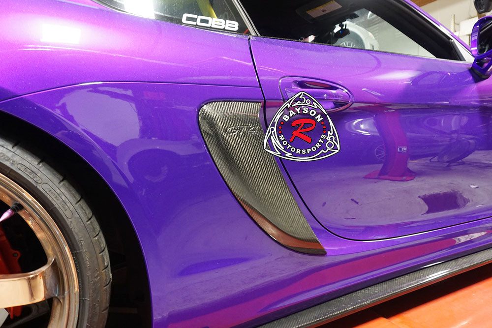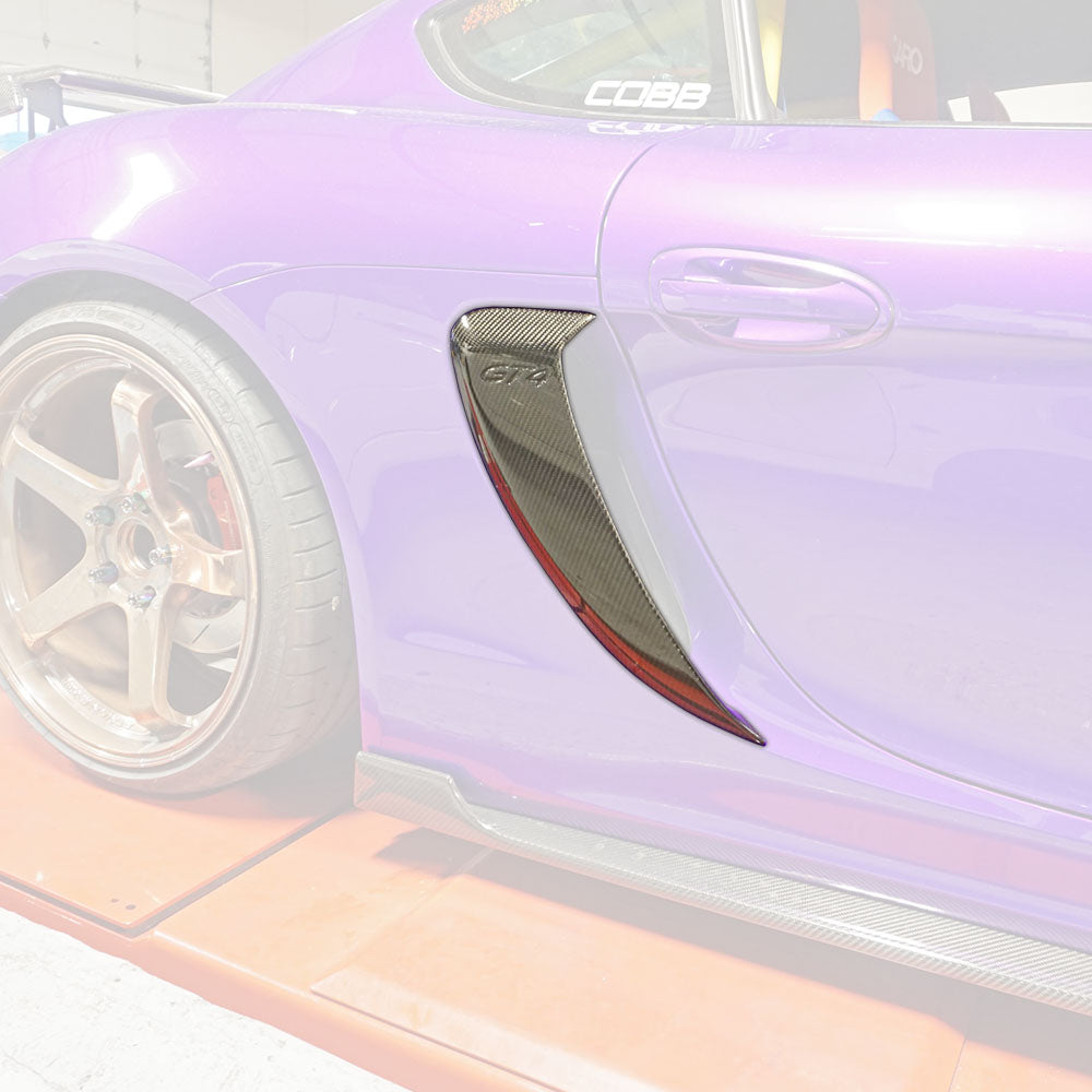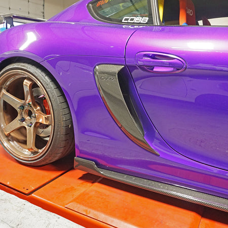 Porsche Cayman/Boxster 981Carbon Fiber Side Scoop with Logo (2013-2016) GT4 Style. Enhance your car's style with this side scoop crafted from genuine, lightweight carbon fiber. Designed for precision fitment, this aftermarket component not only elevates your vehicle's aerodynamic profile but also reduces weight compared to stock parts. Its high-quality carbon fiber construction ensures durability and a premium finish, providing both functional airflow improvement and a striking visual upgrade. Ideal for enthusiasts seeking expert-level performance enhancements and authentic styling cues without compromising on quality.