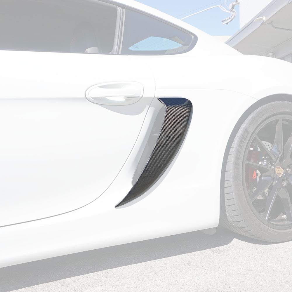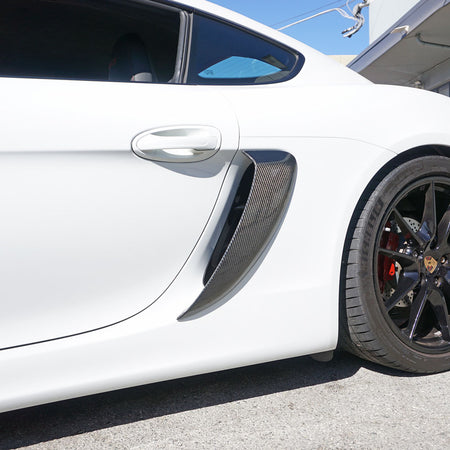 Porsche Cayman/Boxster 981Carbon Fiber Side Scoop without Logo (2013-2016) GT4 Style. Enhance your car's style with this side scoop crafted from genuine, lightweight carbon fiber. Designed for precision fitment, this aftermarket component not only elevates your vehicle's aerodynamic profile but also reduces weight compared to stock parts. Its high-quality carbon fiber construction ensures durability and a premium finish, providing both functional airflow improvement and a striking visual upgrade. Ideal for enthusiasts seeking expert-level performance enhancements and authentic styling cues without compromising on quality.