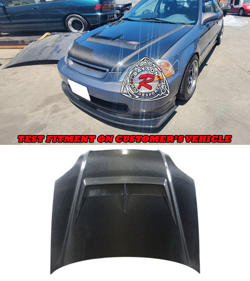 Honda Civic 2Dr/3Dr/4Dr Carbon Fiber Hood (1996-1998) JS Style, Premium aftermarket replacement hood designed to enhance both performance and aesthetics. Crafted from lightweight, high-quality real carbon fiber, this hood significantly reduces vehicle weight, contributing to improved handling and acceleration. Its precise fit ensures seamless integration with your vehicle, while the aggressive styling hood adds a distinctive, sporty appearance. Engineered for durability and strength, this hood is an excellent upgrade for enthusiasts seeking to combine functional performance gains with striking visual appeal.