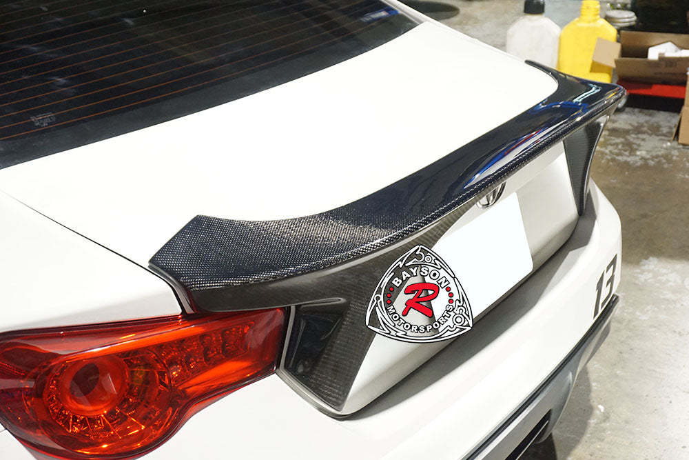 Subaru BRZ Carbon Fiber Spoiler (2012-2021) RA Style. Enhance your car's appearance with the this spoiler crafted from durable fiberglass. This aerodynamic wing spoiler is designed to increase down force, improving vertical force on the rear of your vehicle. The added down force enhances grip and traction, especially at higher speeds, contributing to better stability and handling. Its precise fit and lightweight construction make it an ideal upgrade for enthusiasts seeking both functional and stylish improvements to their cars rear profile. Elevate your car's driving dynamics while giving it a sleek, aggressive look.