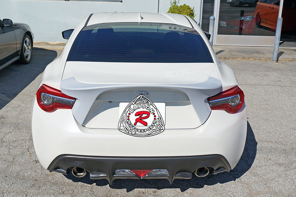 Subaru BRZ Spoiler (2012-2021) Fiberglass RA Style. Enhance your car's appearance with the this spoiler crafted from durable fiberglass. This aerodynamic wing spoiler is designed to increase down force, improving vertical force on the rear of your vehicle. The added down force enhances grip and traction, especially at higher speeds, contributing to better stability and handling. Its precise fit and lightweight construction make it an ideal upgrade for enthusiasts seeking both functional and stylish improvements to their cars rear profile. Elevate your car's driving dynamics while giving it a sleek, aggressive look.