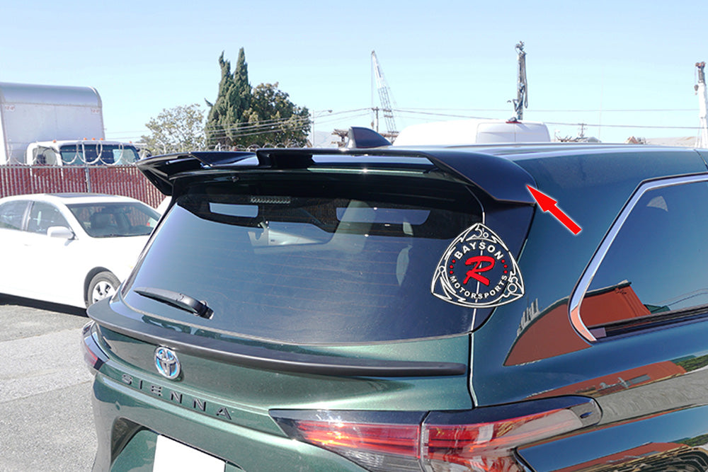 Toyota Sienna Spoiler (2021-2026) V2 Style. Enhance your car's appearance with the this spoiler crafted from durable fiberglass. This aerodynamic wing spoiler is designed to increase down force, improving vertical force on the rear of your vehicle. The added down force enhances grip and traction, especially at higher speeds, contributing to better stability and handling. Its precise fit and lightweight construction make it an ideal upgrade for enthusiasts seeking both functional and stylish improvements to their cars rear profile. Elevate your car's driving dynamics while giving it a sleek, aggressive look.